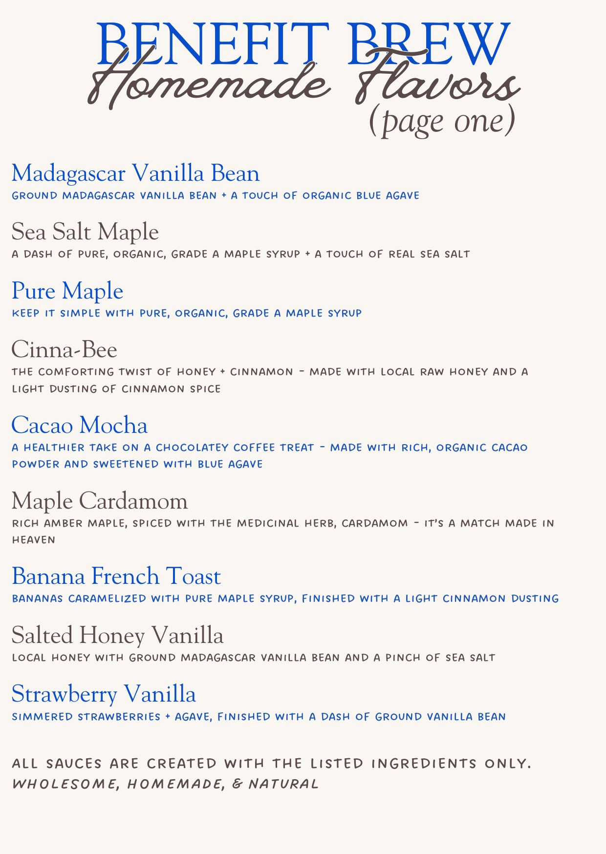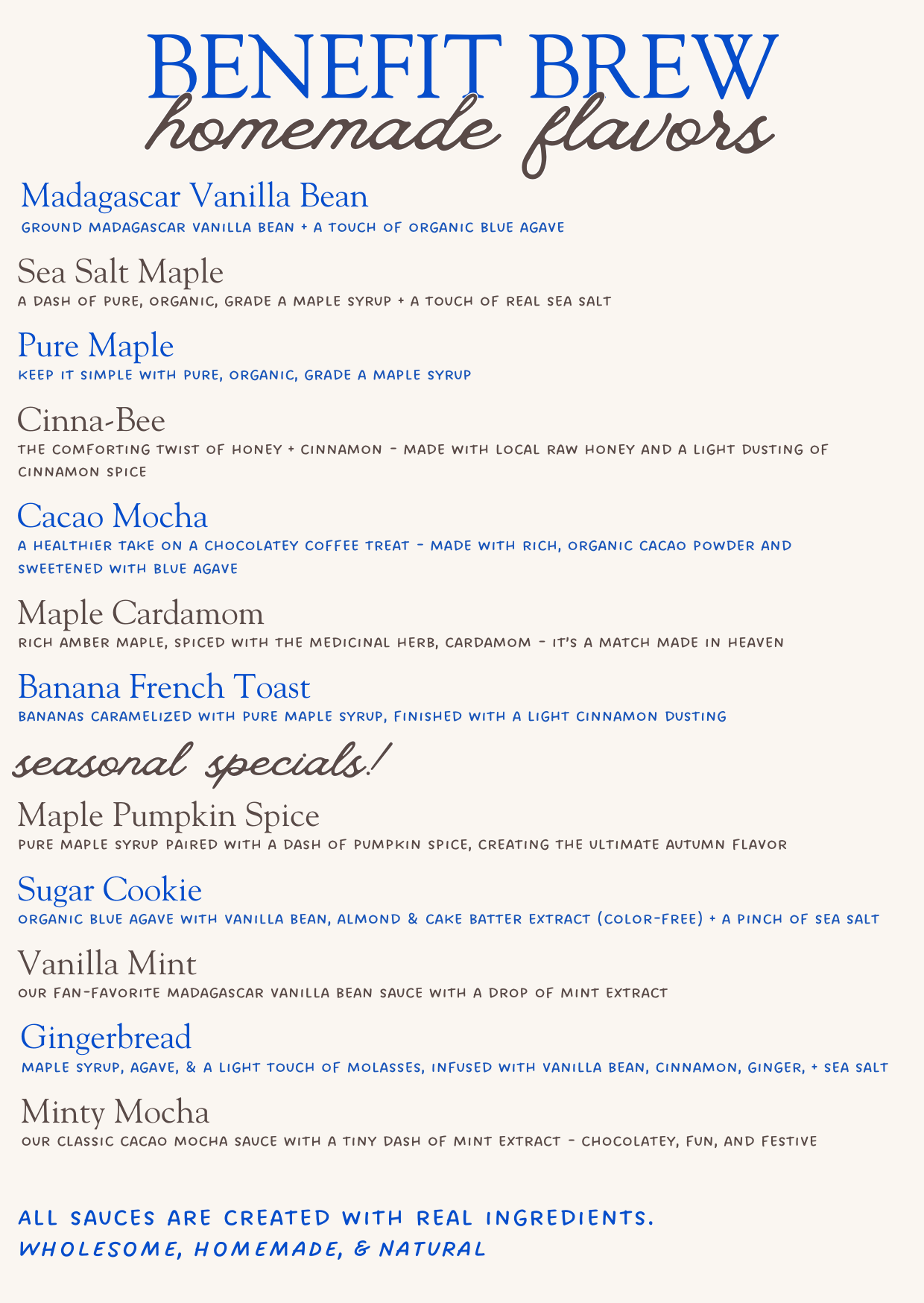 Our flavors are homemade, using wholesome ingredients that you can feel good about. We also offer healthy add-ins for extra nutrients. Read about them below!